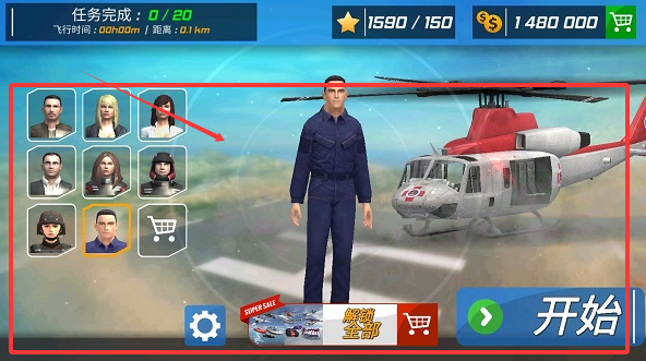 1、在进入游戏后,可以选择不同的角色来完成本次的飞行任务,点击开始。