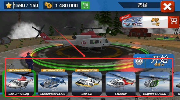 2、在开始任务之前,可以挑选自己的直升机,在这里有数十种不同风格的直升机选择,选择完成后,点击开始执行任务。