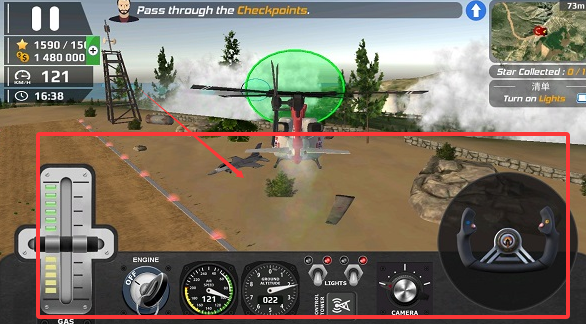 3、前后左右推动可以控制直升机的飞行高度左侧,滑动虚拟摇杆可以控制直升机飞行方向。
