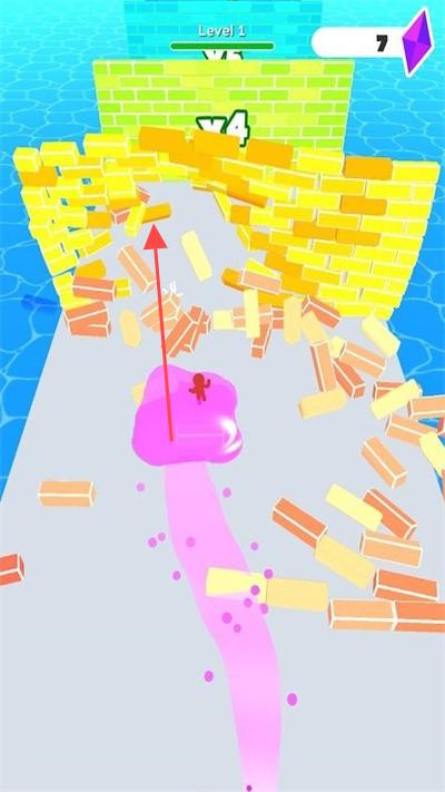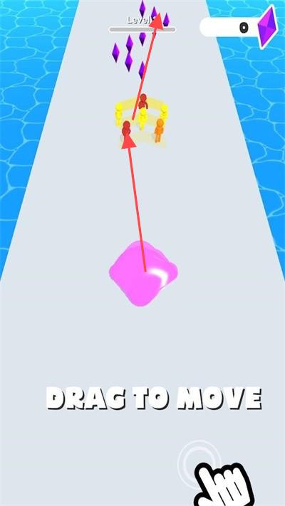 1、玩家通过拖动屏幕操控粉色粘液状角色在道路上移动,躲避或应对前方障碍。