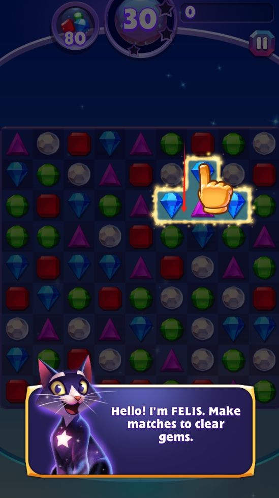 3、在界面中,按提示滑动宝石,使三个及以上相同宝石匹配消除,完成关卡目标。