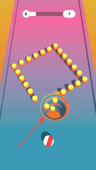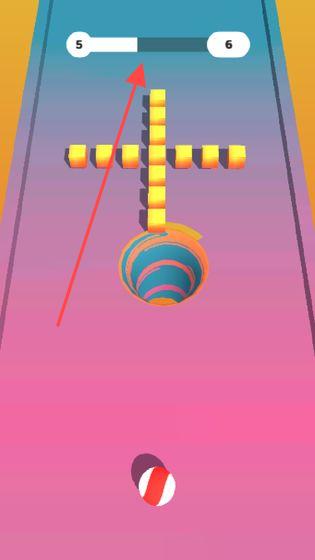 1、进入游戏关卡后,操控球移动,按箭头指示瞄准并进入带有黄色方块的洞,收集方块并推动顶部进度条从当前数值向目标数值推进。
