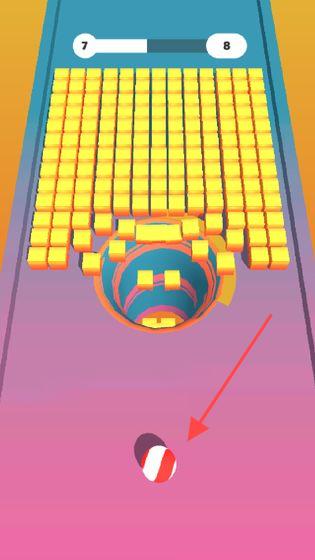 2、在行进中,球会撞击大量黄色方块,持续收集方块以获取分数,同时促使进度条从7向8推进,助力关卡进程。