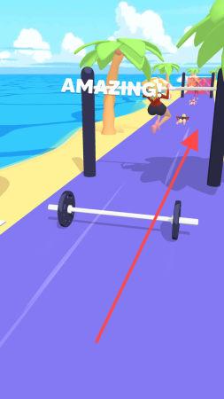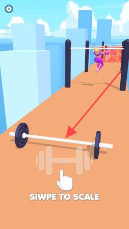 2、看到提示“SWIPETOSCALE”时,及时滑动调整杠铃位置,确保角色顺利通过。