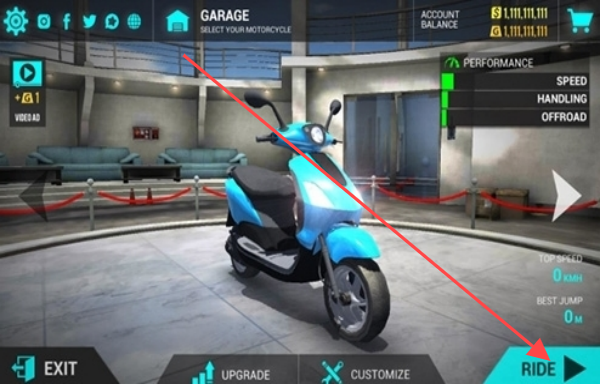 1、在【GARAGE】界面选择心仪摩托车后点击【RIDE】进入游戏驾驶环节开启摩托驾驶冒险。