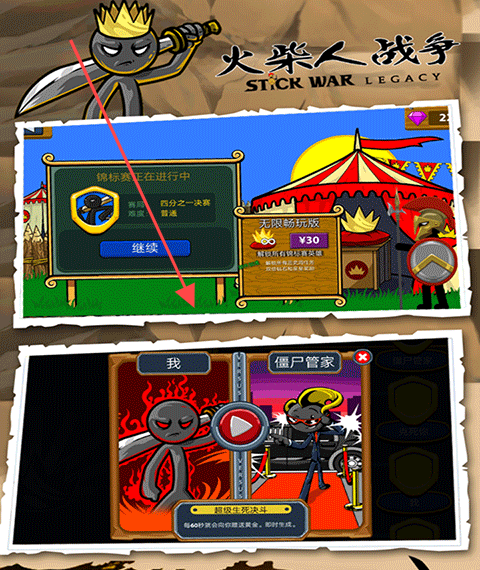 1、在火柴人战争点击【继续】参与锦标赛,如【四分之一决赛】,或开启【超级生死决斗】挑战对手。