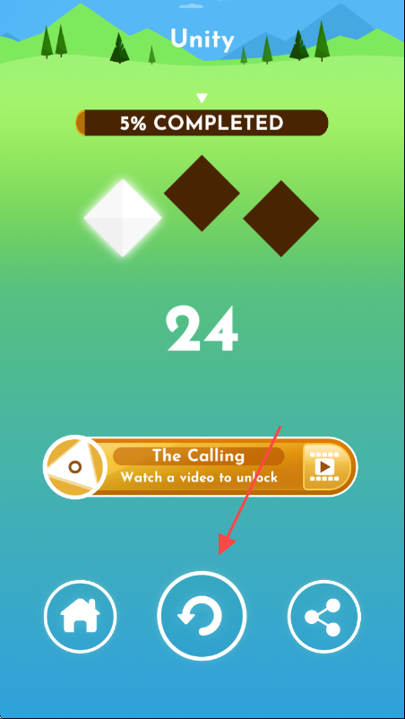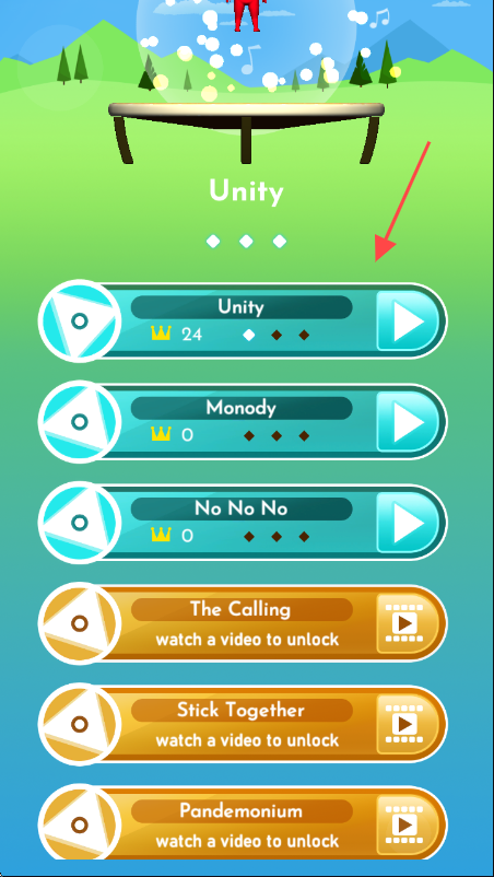 1、进入游戏关卡选择界面,点击箭头所指的【Unity】播放按钮,开启游戏。