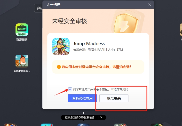 3、将呆鸡大暴走apk拖入到雷电模拟器,点击已了解此应用,再点击继续游戏即可进入游玩。