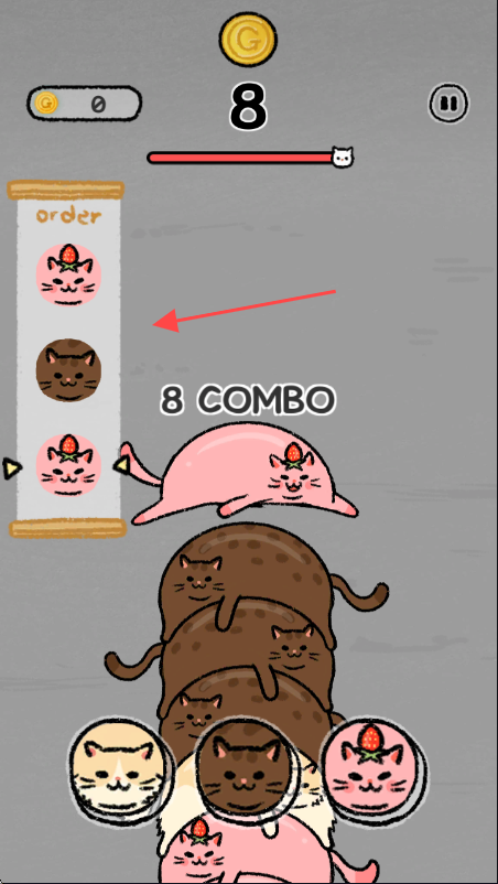 2、游戏中,留意左侧【order】订单列表,按箭头指示选择对应猫咪图案进行操作。
