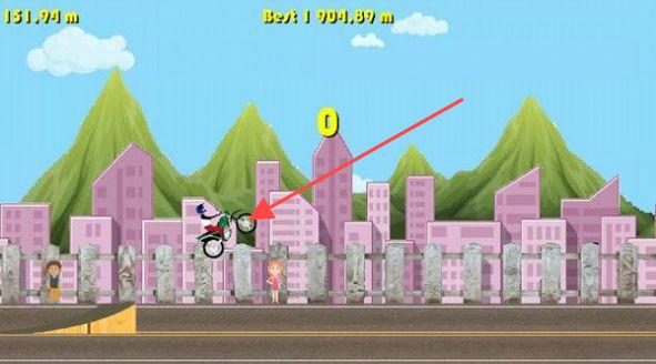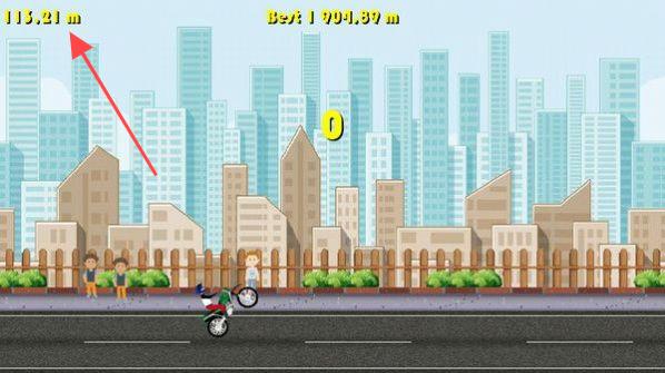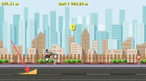 1、进入游戏画面,操控摩托车行驶,利用【黄色斜坡】等道具助力,如第一张图所示,在城市建筑背景下开启行程,上方显示距离与最佳成绩。