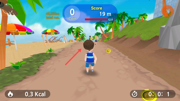 3、在跑步游戏中按【箭头】所指方向,操控角色沿着道路前进,收集金币,提升分数。