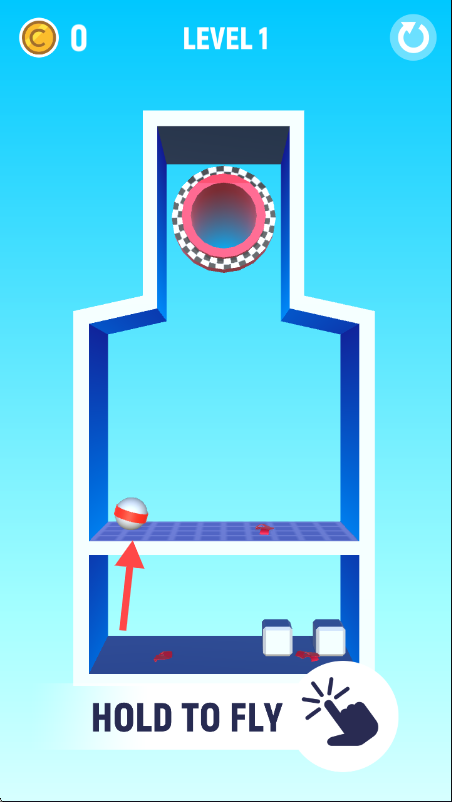 1、进入【LEVEL 1】,按【HOLD TO FLY】提示,按住屏幕让球飞起,按箭头方向操控。