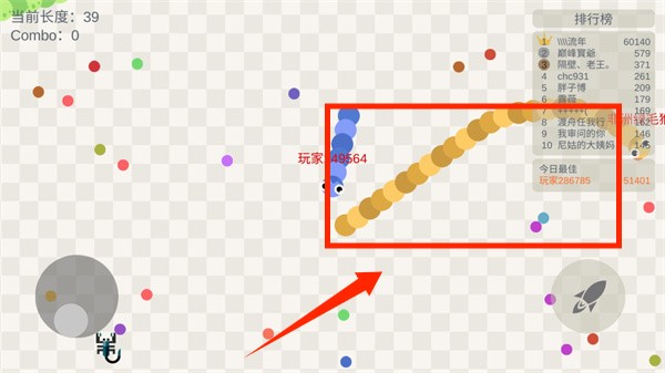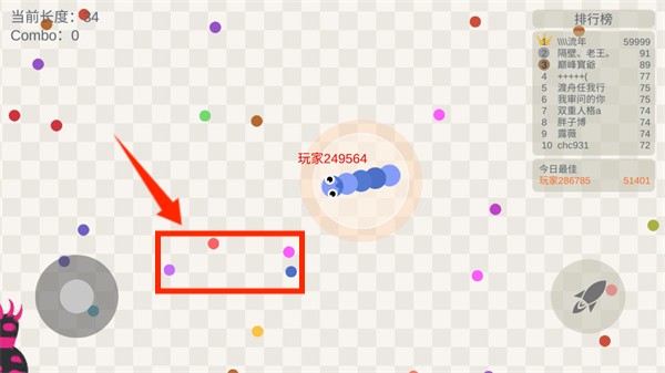 2、控制移动方向,吞噬场景豆子与弱小对手,不断成长壮大。