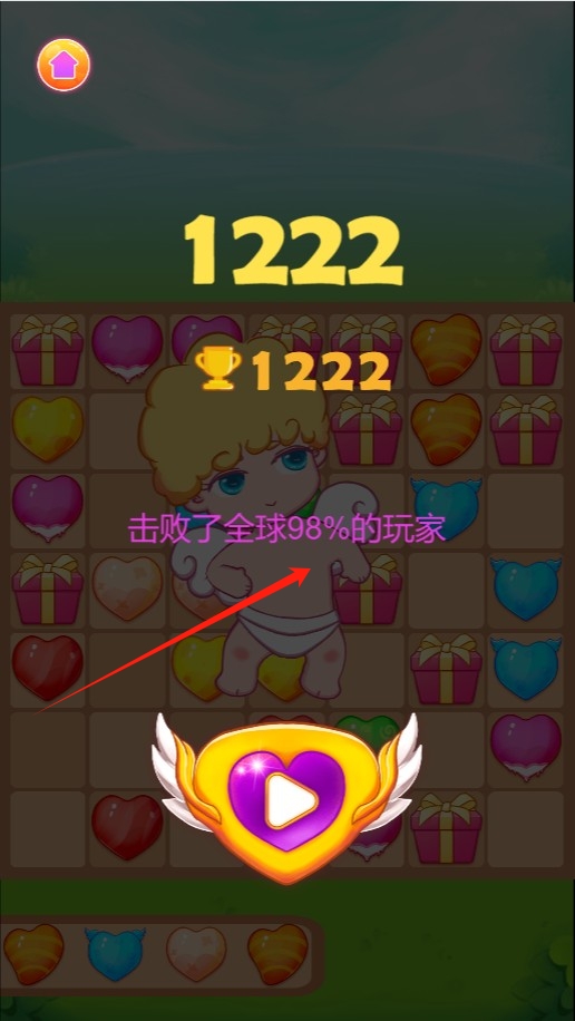 4、关卡目标达成:根据每关目标如消除特定颜色糖果、解救指定数量丘比特等,制定消除策略,在限定步数或时间内完成任务。