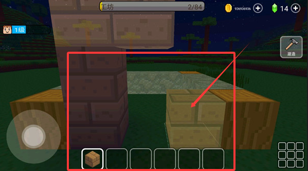 1、基础建造教学初始需搭建工坊,通过方向杆选定位置,逐步放置方块完成基础结构。