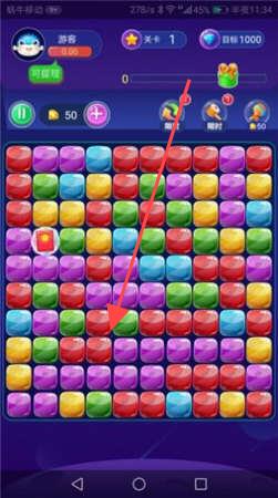 2、在游戏主界面,点击图示区域进行消除操作,通过消除彩色方块完成任务,享受消除乐趣,积累游戏分数。