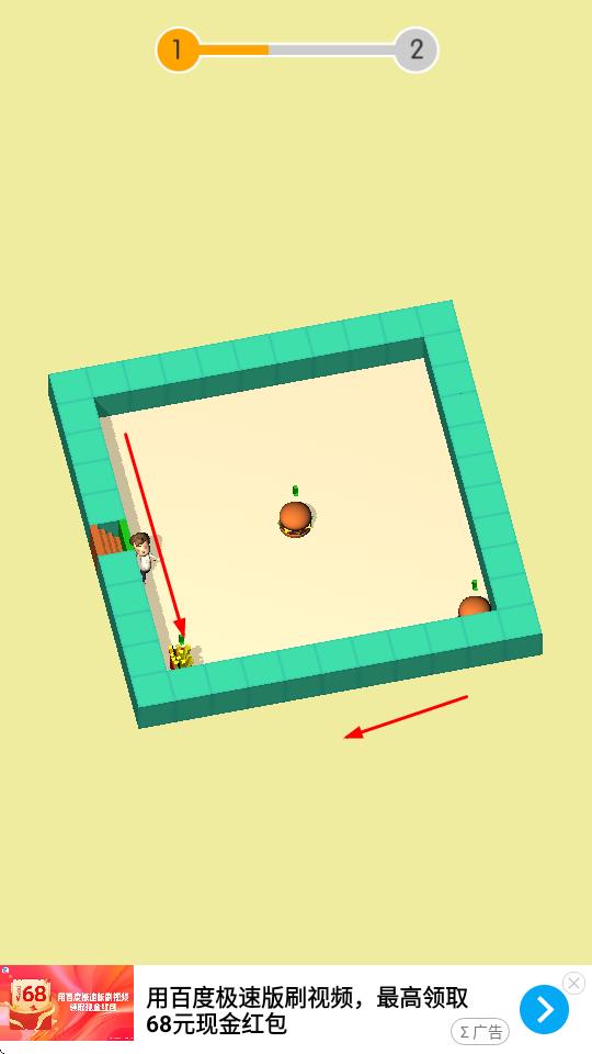1、点击屏幕开始游戏,滑动屏幕控制迷宫旋转,人物会固定向下移动,通过移动迷宫来让人物吃到快餐。