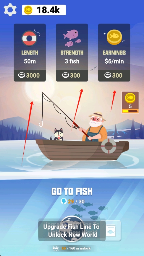 3、钓鱼赚的钱可以用来升级鱼钩鱼饲料,以及使鱼的价格升高。