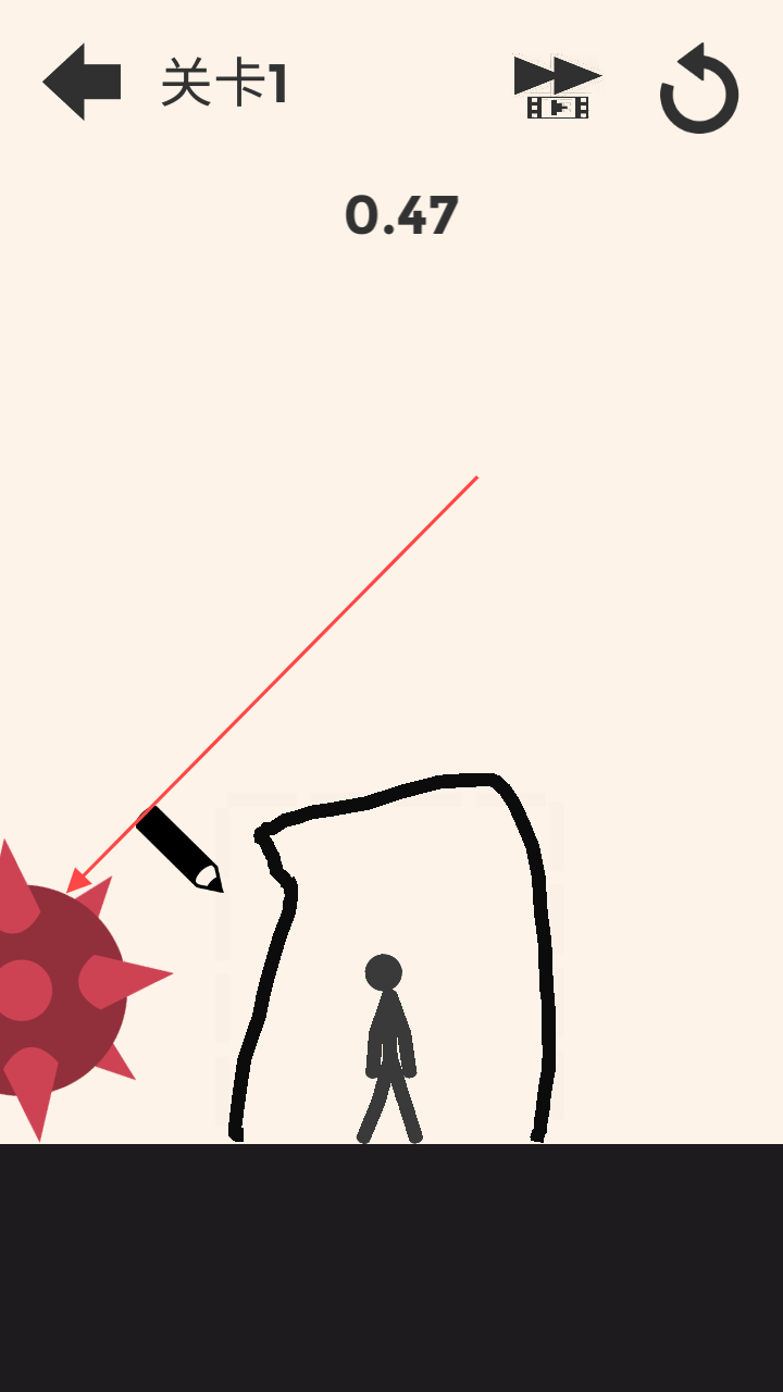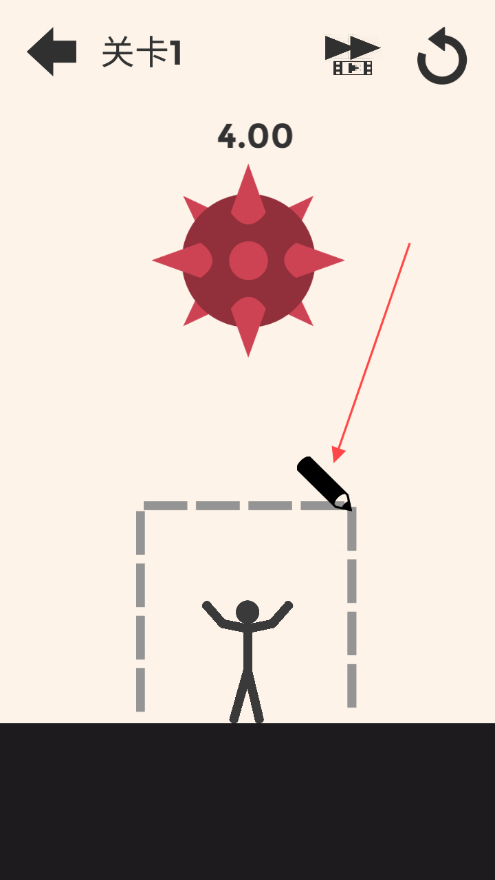 1、进入关卡1界面后,点击图示画笔位置开始绘制保护结构,阻挡带刺红球,确保小人安全,这是开启游戏挑战的关键操作。
