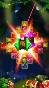 1、彩色宝石碰撞,中间绿色与紫色宝石引发绚丽爆炸特效,多彩光芒闪耀,消除周围宝石。
