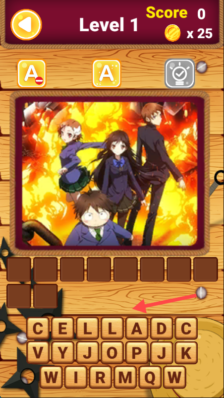 2、在关卡中,根据图片内容,按箭头指示操作,从字母键盘中选择字母拼出正确答案。