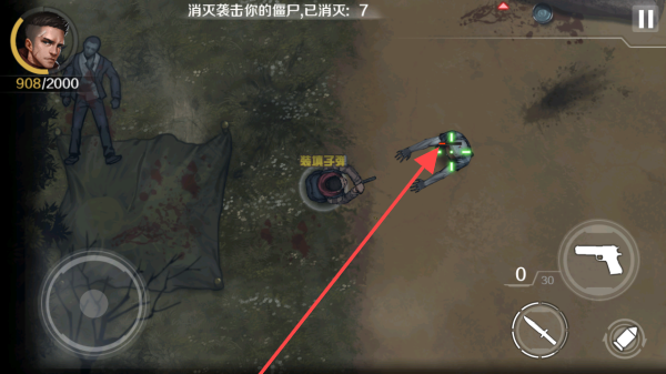 3、战斗场景中按提示【消灭袭击你的僵尸,已消灭:7】利用武器攻击僵尸并适时补充弹药。