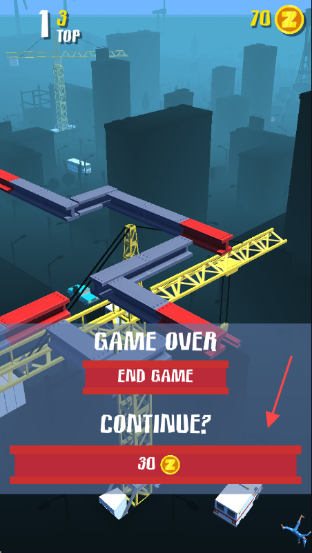 3、游戏显示【GAME OVER】后,可花费金币选择继续游戏,或点击结束游戏。