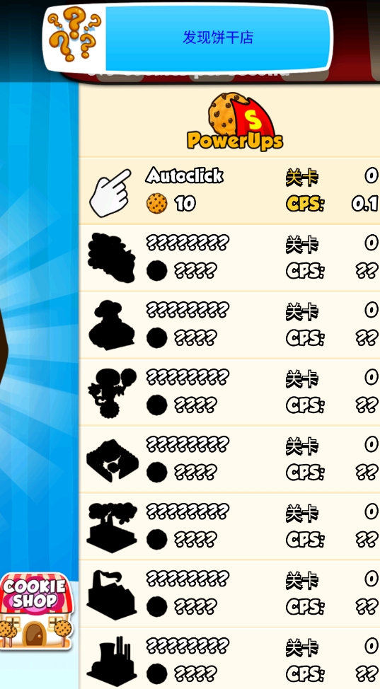 3、进入PowerUps界面,使用资源购买Autoclick等道具,助力后续关卡推进。