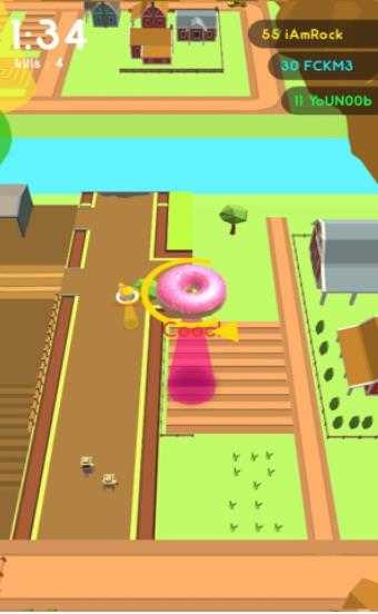 3、沿着【粉色甜甜圈状轨迹】操控物体移动,在乡村道路和农田间快速行进,留意时间与【kill】数,确保游戏进程顺利。