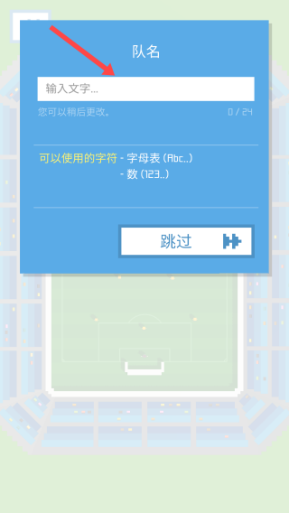1、在队名输入界面,点击【箭头】所指的输入框,输入心仪的队名;若不想输入,可点击【跳过】按钮进入下一步。