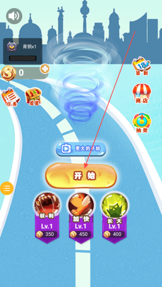 1、进入游戏主界面,点击【开始】按钮开启游戏,界面上有【签到】【商店】【抽奖】等功能入口。