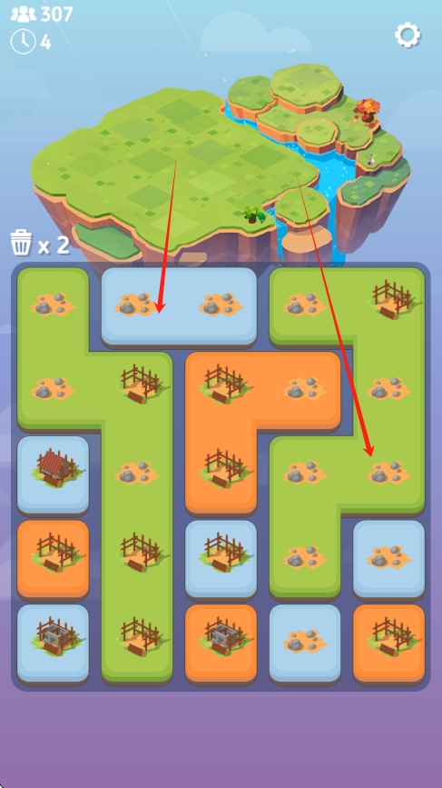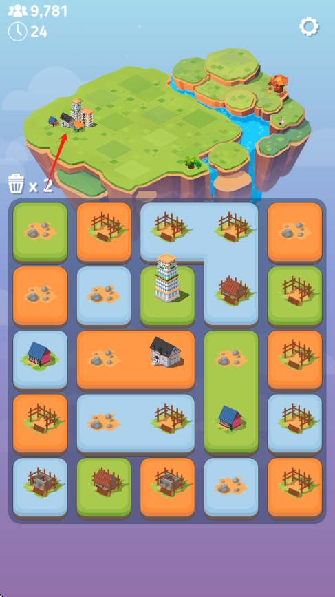 3、合并方块,同级的方块合并还会升级,升级过的房屋建筑等在最上方的地图上也会显示。