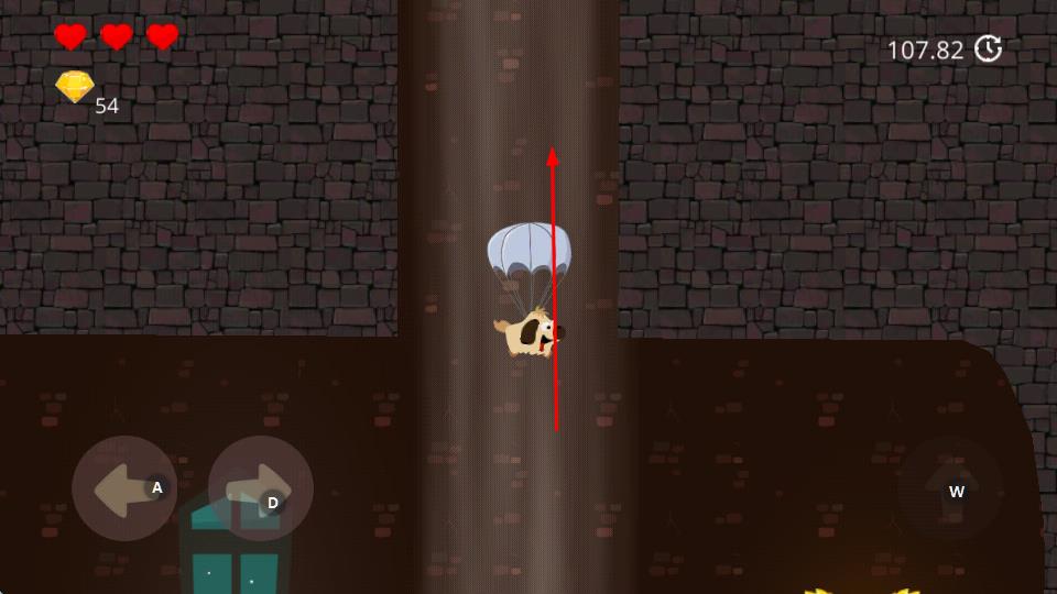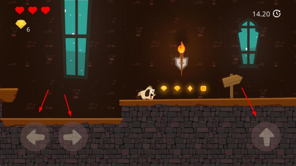 1、玩家通过屏幕下方的虚拟按键(如左右移动键、跳跃键)操控小狗角色在场景中移动、跳跃。