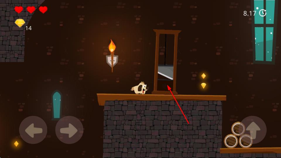 3、场景中存在如断头台等危险机关,玩家需操控小狗躲避,同时还要注意剩余生命值。