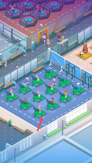 1、在游戏场景中,点击【箭头】所指的位置,可能是选择或管理该位置上的健身器材或人物。