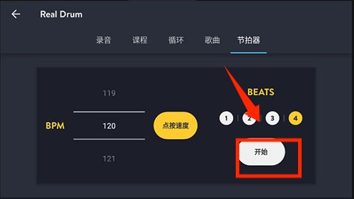 2、点击左上角黄色的按钮,进入节拍器界面,可自行设置。