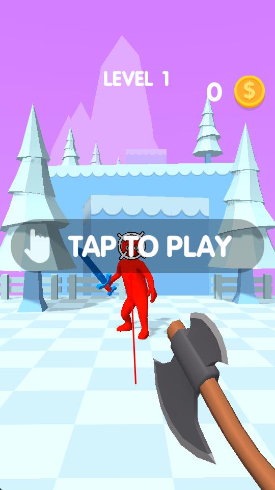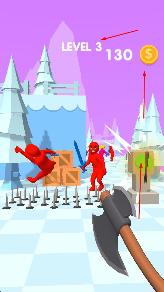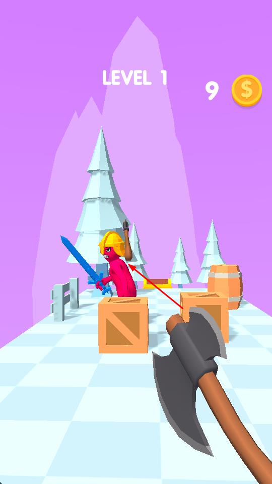 1、玩家通过点击屏幕操控视角和斧头投掷方向,对前方红色敌人进行攻击。