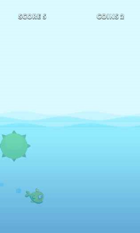 2、游戏过程中,留意【SCORE-5】和【COINS-2】,控制小鱼躲避绿色障碍物,收集金币提升分数。
