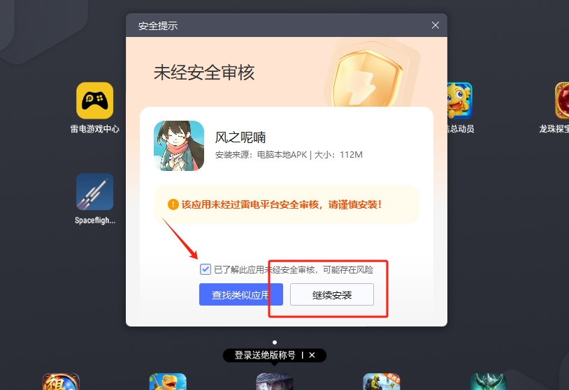 3、将风之呢喃apk拖入到雷电模拟器,点击已了解此应用,再点击继续游戏即可进入游玩。
