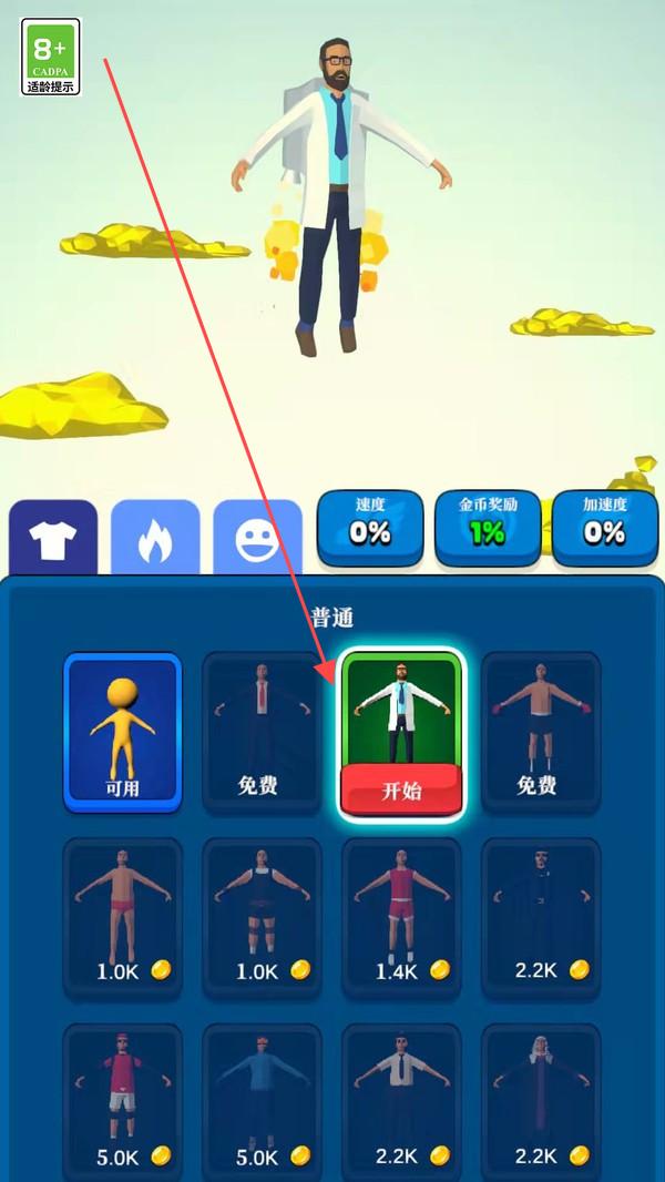 1、在角色选择界面,可选择如“普通”形象点击【开始】进入游戏。也可根据金币数量,解锁购买其他角色,提升游戏趣味性。