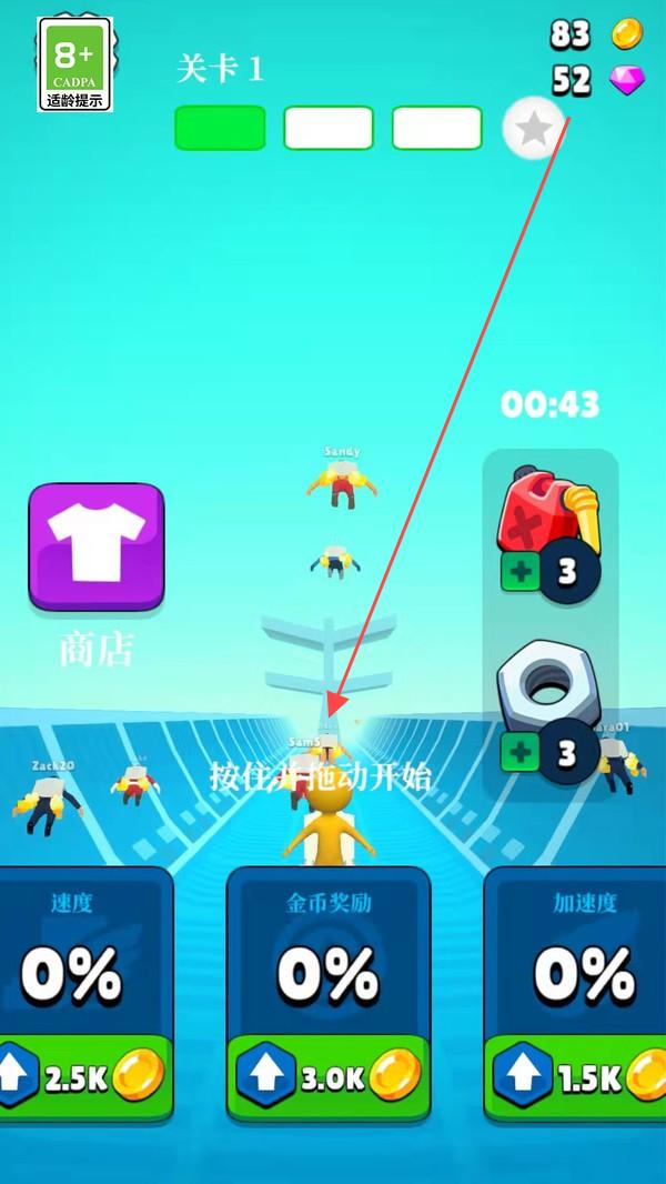 2、进入关卡1后,按照【按住并拖动开始】提示,操控角色前进。途中注意收集金币(如83)、钻石(如52)等资源,以及道具(如汽油、螺母),提升角色能力。
