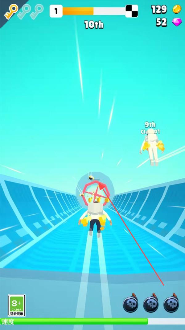 2、道具助力闯关:赛道上随机分布加速火箭、护盾、磁铁等道具,拾取后可获得加速、防护、吸附金币等特殊效果,帮助玩家突破障碍,冲击更高分数。