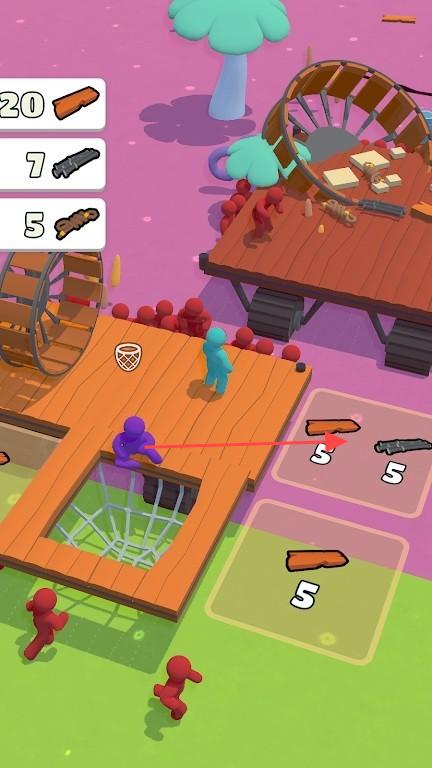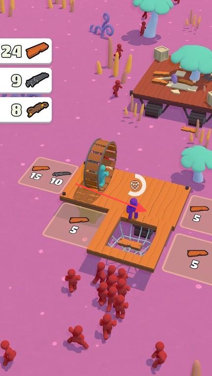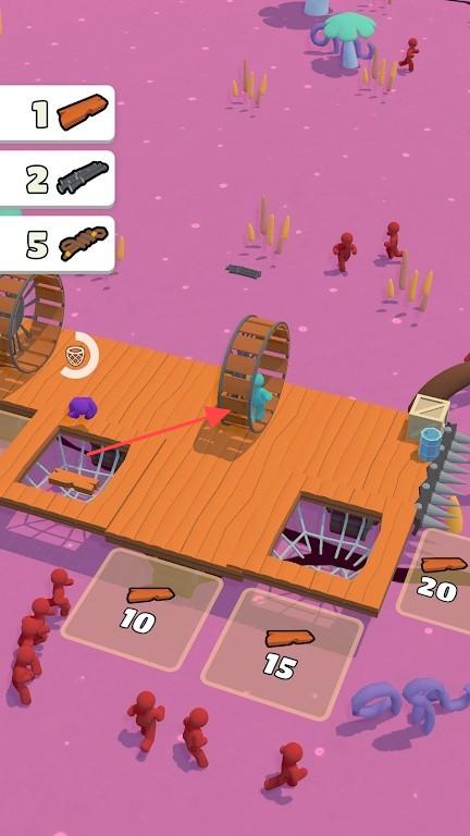 2、场景中有红色和蓝色小人,玩家需操控紫色小人利用收集到的武器与他们对抗。