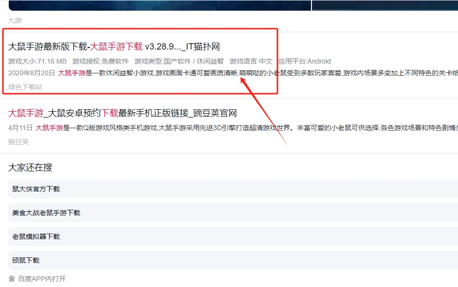1、在百度网站上搜索大鼠下载,并点击图片标记的链接进去下载。