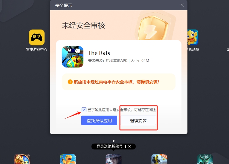 3、将大鼠apk拖入到雷电模拟器,点击已了解此应用,再点击继续游戏即可进入游玩。
