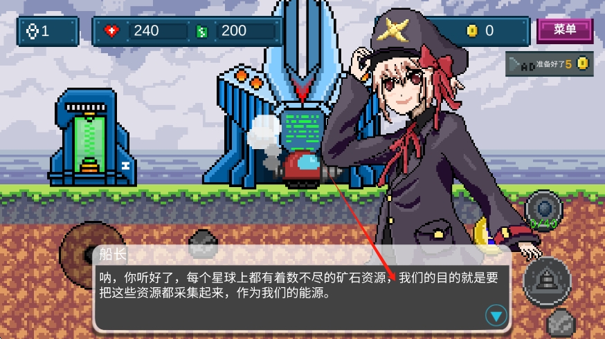 1、根据游戏提示我们的主要人物就是收集矿石资源,作为能源生存。