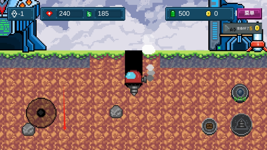 3、摇杆向下滑,或者点击屏幕下方,再点击钻头图标,可以控制矿车钻地。