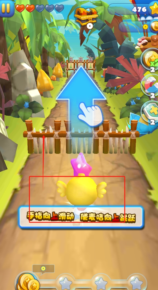 2、在游戏过程中,看到障碍物时,手指向上滑动,让麦咭向上跳跃躲避。