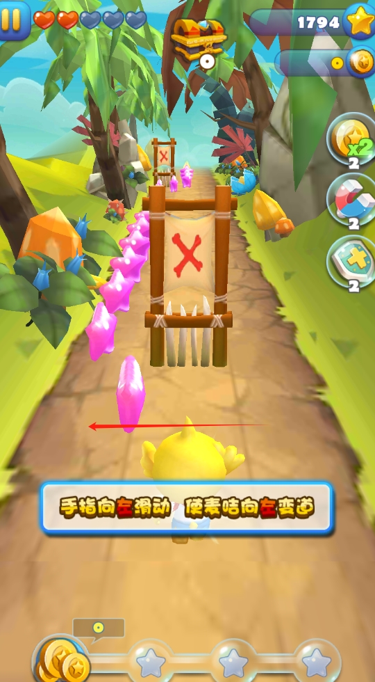 3、遇到需要变道的情况,按照提示手指向左滑动,操控麦咭向左变道避开障碍。