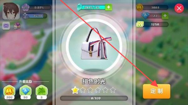 3、遇到物品定制界面,像【拼色时光】包包,点击【定制】按钮,投入资源(如消耗金币、钻石等)提升物品星级,获取升星奖励,助力游戏发展。